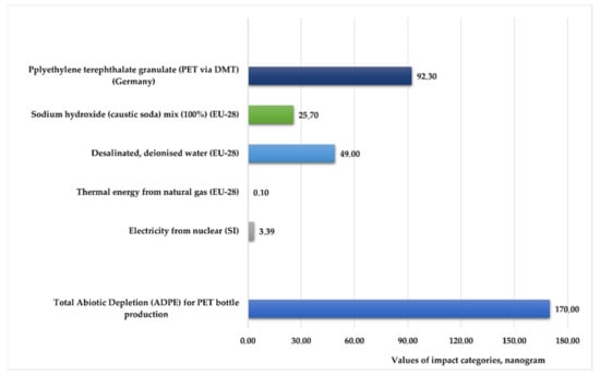 One goal of this research was to determine abiotic depletion as an environmental impact category and primary energy resources for the production life cycle of polyethylene terephthalate (PET) products using a professional dataset. After quantifying the abiotic resource depletion, the life cycle analysis was conducted using GaBi 8.0 (version: 10.6) software (by Sphera Solutions Ltd., Stuttgart, Germany). Modeling a plastic product requires the use of product-specific input data. The Life Cycle Inventory (LCI) method includes and quantifies the input-output material flow and the energy requirements of unit manufacturing. This methodology divides the energy requirements and environmental emissions between the PET products produced by mass allocation. The dataset for polyethylene terephthalate corresponds to the EU average. The inventory is primarily based on industry data from internationally relevant production processes. During manufacturing, we assumed no manufacturing loss. Output was used to determine the abiotic resource depletion and primary energies of 4 kg of PET. Using the CML life cycle impact assessment method (developed by the Centre for Environmental Science at Leiden University, Leiden, The Netherlands), we determined the abiotic resource depletion and primary energies. During that analysis, the reference system utilized the electricity energy inputs for each country. We did not use normalization and weighting to calculate the magnitude of impact category indicators.