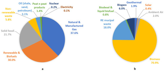 (a) Heating and cooling fuels, breakdown in EU@ Eurostat, 2019. (b) Renewable Heating and cooling, fuels breakdown in EU@ Eurostat, 2019.