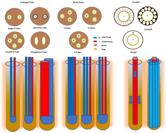 There are two primary techniques used for shallow geothermal systems to heat buildings, namely, the closed-loop and open-loop systems. In the first type, the heat carrier fluid is forcefully circulated through a buried or submerged ground heat exchanger. This type is the most prevalent shallow geothermal system in Europe. Some practical examples of closed-loop systems are vertical loops, horizontal loops, energy piles, and groundwater coil. For a large available space, the horizontal loop (0.2 to 2 m depth) is a more cost-effective option, while vertical loops (<300–500 m) are mostly used in urban areas with smaller land occupancy to reach a higher thermal gradient. The vertical BHE consists of a hole drilled in the ground and completed with different pipe geometries such as single/double or triple U-shaped tubes, co-axial, and multi-pipe configurations. Recent developments in ground BHEs have focused on the design of new innovative structures [28,29,30,31,32] and the use of thermally enhanced materials [33,34,35,36,37,38,39,40,41]. Figure 3 illustrates a variety of common and innovative BHE configurations.