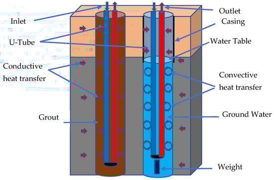The thermal efficiency of BHE is characterized by the thermal resistance between the circulating fluid and the borehole wall [12]. Two methods can be used to estimate the BHE’s thermal resistance: either thermal response tests (TRT) [13,14] or numerical calculations [15]. The thermal resistance of BHE depends on the properties of the circulating thermal fluid, flow rates, borehole diameters, collector-pipe geometry, collector-pipe material, and grout [12]. The lower the BHE thermal resistance is, the better the thermal performance behavior. The lower BHE thermal resistance can be achieved by using thermally enhanced pipes and grout, increasing the surface area of the loop, and locating the legs proximal to the borehole [16].