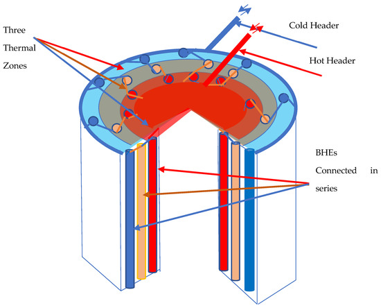 The first BTES system established in the world was in Sweden, in 1983, after the energy shortage crisis [80]. As of today, many BTES projects have been completed globally, mostly for storing solar energy in the summer for usage later in the winter [81,82,83,84,85]. BTESs employ vertical boreholes that are piped in series to create concentric thermal zones (Figure 6) or piped in parallel as a normal closed-loop BHE (Figure 7). The former has the advantages of creating cold and warm zones as well as the possibility to switch to a reverse flow. In the BTES charging process, hot water flows into an inner header of the BTES and then flows into a decreasingly hotter two or up to six parallel thermal zones. The cold water returns to the building from an outer circumferential header around the perimeter of the borehole field. This process could be reversed during the BTES discharging period.