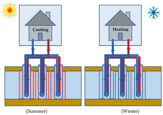 Thermal energy storage is basically divided into three types, sensible, latent heat, and thermochemical storage [73]. Underground thermal energy storage (UTES) systems store thermal energy in natural underground formations. Generally, a UTES uses aquifers (ATES) or boreholes (BTES) to store sensible heat by lowering or raising the temperature of water [74]. Some new UTES systems incorporate latent heat storage, where the phase of the heat storage medium changes from solid to liquid. This has been demonstrated as a viable heating and cooling system for residential, commercial, and institutional buildings throughout Europe and North America [75]. BTESs could make an important contribution in areas where seasonal demands vary substantially [76]. In addition, renewable energy sources such as solar and wind energy are intermittent sources—that is, the energy produced is fluctuating on a daily, weekly, or seasonal basis [77,78]. This causes an imbalance in energy demand and supply. UTESs can store surplus solar and waste thermal energy collected in the summer which can be used in the winter [79]. Figure 5 illustrates the ATES system, which recycles surplus heat and cooling from buildings. Each well in the ATES system is capable of injecting or producing water, and at the same time the water flow is reversible.