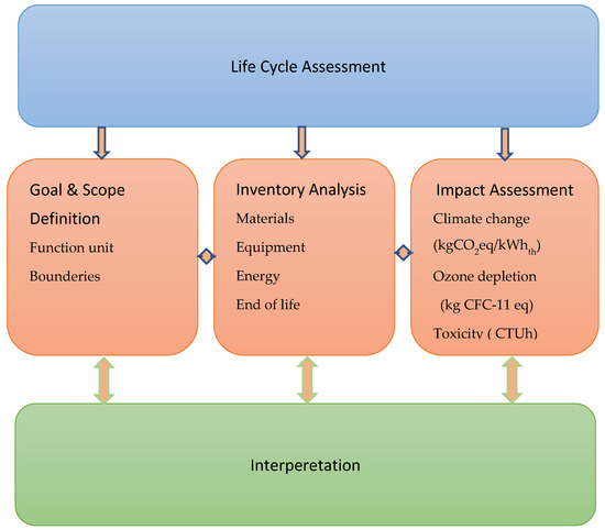 Life cycle analysis (LCA) is a method for studying the environmental impacts and environmental aspects of a product or system during its life cycle [110]. LCA is required for assessing GSHPs’ potential environmental issues and sustainability over its lifetime. There are four components of the LCA process according to ISO standards 14040 and ISO14044: goal definition and scoping, inventory analysis, impact assessment, and interpretation (see Figure 10). LCA is necessary to make informed decisions about alternative fuels and technologies. For a consistent comparison between the alternatives, a common unit is used to express the results for the same output. This common unit is the functional unit (CO2 eq/kWh). To accurately estimate the environmental impact, the LCA should consider the manufacturing of equipment, materials, transportation, execution, use, and disposal [111,112]. Astu and Pratiwi (2021) conducted LCA for shallow and medium depth geothermal systems [113]. The results indicated that shallower systems with connected heat pumps have better environmental performances than systems with district heating. This depends on the fuels and grid used in the study’s district heating system. In addition, the environmental impacts of the geothermal systems were lower than those of fossil fuels, except for mineral resource scarcity, especially with decentralized heat pumps and free cooling.
