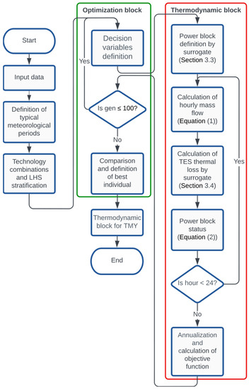 Figure 2 shows the algorithm flowchart, which includes the optimization block and the thermodynamic block. Firstly, the algorithm read the input data, which was composed of economic and historic climate information as well as the avaliable collectors and waste heat characterisctics that were selected by the user. Then, it defined the typical meteorological period (the user could choose between 1, 4, 12 or 52 typical days or a whole typical year; however, for the sake of simplicity, Figure 2 is for one typical day) to compress the historical climate input and the number of possible combinations of collectors and waste heat sources as well as the LHS stratification of the decision variables. The optimization block defined the decision variables, i.e., the configuration and sizing of the HSF, the tank capacity and the power block operational point (, and ), which were assigned to every individual that was provided by the genetic algorithm. The thermodinamic block, in turn, defined the best power block for the selected operational point based on its surrogate model and then calculated the hourly mass flow and the TES heat loss to define the power block status at each hour of the selected typical period.