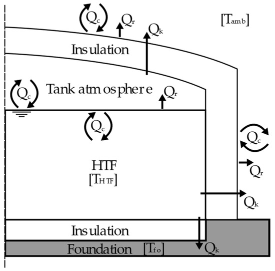 Figure 3 shows the heat loss mechanisms that were considered, i.e., radiation (r), convection (c) and conduction (k), in each part of the tank. The ambient temperature was available hourly and the foundation temperature was maintained below 90 °C using a cooling system to avoid cracking, as indicated in [39]. The tank insulation thickness followed the Petrobras technical standard N-550 [40], which relates the insulation thickness to the tank diameter and its operational temperature. The NBR 7821 standard [41] was used to define the thickness of the tank’s steel sheets.