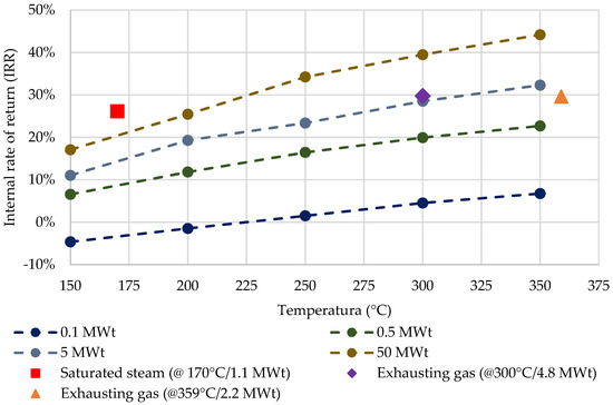 The isolated points in Figure 4 represent the real waste heat sources near the selected area. The saturated steam (red square at 170 °C/1.1 MWt), exhaust gas (orange triangle at 359 °C/2.2 MWt) and the second exhaust gas (purple rhombus at 300 °C/4.8 MWt) provided 0.13 USD/kWhe, 0.11 USD/kWhe and 0.11 USD/kWhe of LCOE, respectively, at their optimum IRR. Only the waste heat and ORC were selected by the algorithm for these cases. It should be noted that the saturated steam provided a high IRR, despite its low temperature. This happened due to its higher overall heat transfer coefficient (), which was 3.6 times higher than the value of the other two cases.