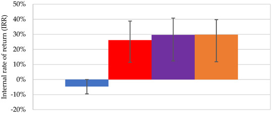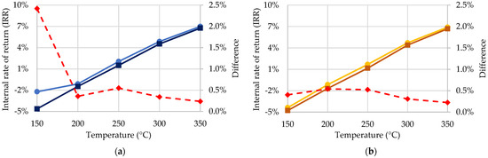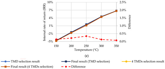 Comparisons of different typical periods of time are plotted in Figure 6: (a) a comparison of the results of a typical day and the results of using a typical day for technology selection and a typical year for final result, i.e., once the technology was selected using one typical day (24 h) and it was then evaluated under the climate conditions provided for an entire typical year (8760 h); (b) a comparison of the results of a period composed of four typical days (one for each season) and the results of using four typical days for technology selection and a typical year for the final result; and (c) a comparison of the results of technology selection using a typical day and the application of a typical year to obtain the final results and the results of using four typical days for technology selection and the application of a typical year to obtain the final results. The maximum difference in the IRR in this last case was 0.3%. This meant that the selection of technology was less sensitive to the typical period used than the final result, but a significant reduction in computational time was obtained due to the reduction from four typical days (5.8 h) to a single typical day (1.2 h) for the technology selection (results obtained using an i5-10400F with 4.3 GHz, 6 cores and 12 threads).