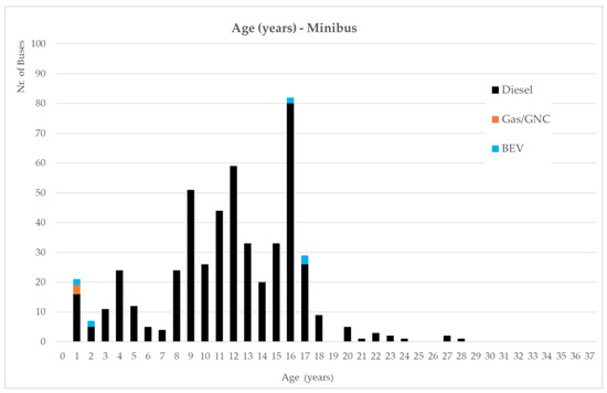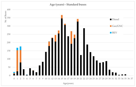 According to Table 2, it is possible to conclude that the distribution is relatively homogeneous and similar between the three types of buses, and it is also possible to observe that the average age of minibuses is about 4 years less than that of standard and articulated buses. In addition, the age range is approximately 30 years, with the maximum age being 35 years for standard buses. From the analysis of the quartiles, it can be seen that more than 75% of minibuses, standard, and articulated buses are over 9, 12, and 10 years old, respectively; that is, close to an age at which they should be replaced (Section 3.1).