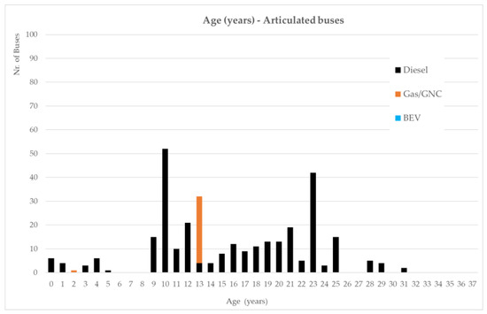 Considering the age of the bus fleet, most of the vehicles are between 15 and 16 years of age, although a slight change can be seen in the last five years regarding the acquisition of low-pollutant buses. The acquisition numbers indicate that almost 10% of the buses bought in the last five years are electrically powered, and more than 40% are fueled by gas/CNG. This shows a shift in the fuel consumed by buses in Portugal; however, most of the fleet is still fueled by diesel—mainly buses that are around ten to twenty-six years of age. Considering this age range of the bus fleet, 94% of the buses are fueled by diesel, almost 6% are fueled by CNG, and less than 1% are powered by electrical batteries.