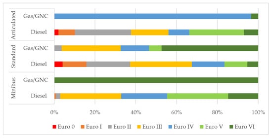 It is possible to conclude that most of the urban bus fleet in Portugal is still fueled by diesel and is within the Euro III emission range, followed by Euro II, when considering the standard buses, which comprise the majority of the bus fleet in the country. The distribution of the Portuguese bus fleet over the Euro emission standards is not very different from the general scenario in Europe, as 28% of all buses rely on Euro III standards, 25% on Euro V, and 18% on Euro II [25]. This information reveals the urgency for a shift in the bus fleet technology to more efficient and sustainable options, and to both less polluting (e.g., Euro V and VI buses) and fully electric buses, not only in Portugal, but in Europe as a whole.
