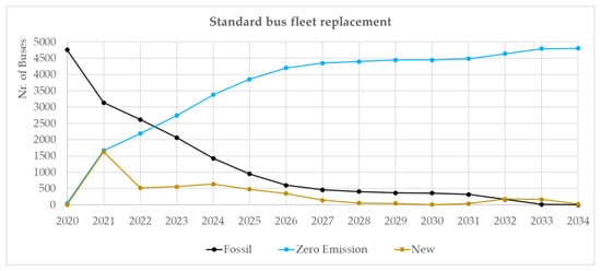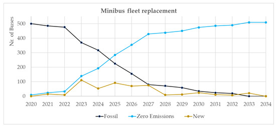 The replacement proposal for the minibus fleet can be seen in Table 7 and Figure 5. It is important to mention that, in this work, the number of buses remains constant over time, and does not take into consideration the possible increase in public transport demand in the country, which is in line with the 2021 Census [32].