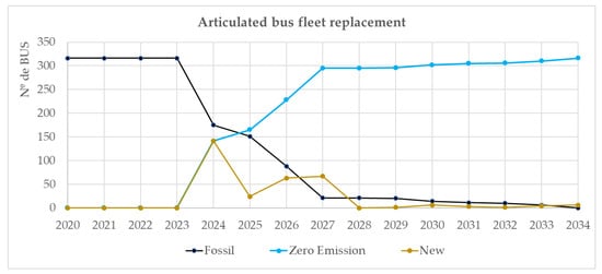 Starting from 2021, all urban buses will be replaced when they reach a predetermined age. As of 2021, buses older than 21 years will be replaced, and, in 2022, buses older than 20 years will be replaced. In the following years, the rule stays the same, which will allow all buses fueled by fossil fuels to be replaced by BEVs and HFCVs by 2028 (Table 5). However, for articulated vehicles, due to their size and weight, it is considered that an electric battery is not the most suitable option, due to increasing operating costs from the weight of the batteries required for this type of bus [26]. Nonetheless, the market is now starting to develop articulated buses fueled by hydrogen. Thus, it is considered that the replacement only should start in 2024, in order to provide more time for the industry to prepare and respond to the market needs.