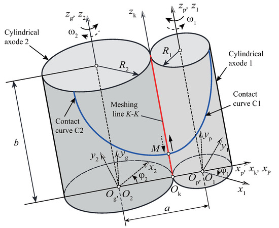For external helical gears with parallel shafts, the applied coordinate systems are shown in Figure 1. , and are fixed to the frame. and are fixed to the pinion and the gear, respectively, and rotate with them. At the beginning of the meshing process, coincides with , and coincides with . The driving and driven tooth profiles contact at the point M, which is the meshing point, and when these two gears rotate, M forms the meshing line K–K in the fixed coordinate system as well as the contact curves and on the cylindrical axodes of the gear pair, respectively.