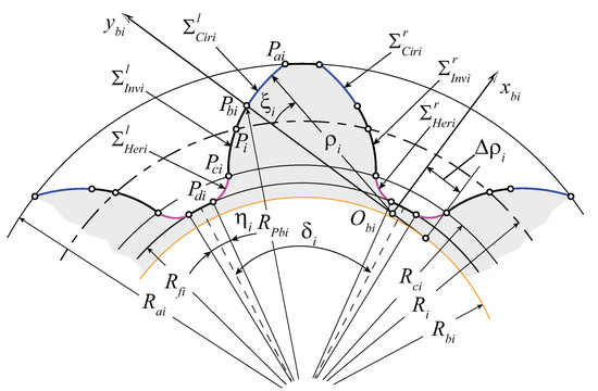 The right tooth profile of can be deduced by mirroring around axis after rotating it an angle in a clockwise direction around axis . Therefore, the position vectors of arcs can be expressed in as follows: