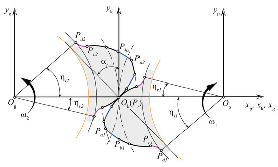 Here, the left tooth profiles of the gear pair are considered as an example of derivation of the formulas for , and the transition fillet curve . The Cartesian coordinate system is shown in Figure 4 for the definition of the parametric equations of . Auxiliary local coordinate systems are also established at points to express . The axes are parallel to . The points are set on the normal lines of the points , at a distance from the tangent points of the normal lines and the basic circles of the pinion and gear.