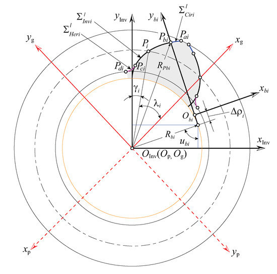 In Equation (3), is the angular parameter of the circular arc . The value of depends on the radius of the addendum circle. When the entire active tooth profile is defined by an involute curve and a circular arc , is equal to 0. However, if the entire active tooth profile is defined by a circular arc, the fillet transition curve will smoothly connect the circular arc at point , and point will coincide with point . At this time, will depend on the length of the radial vector of and the radius of the circular arc .