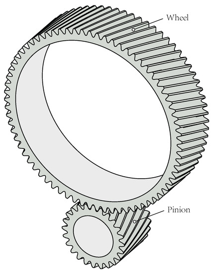 Figure 5 shows the 3D model of an external helical gear drive corresponding to case 1, according to the parameters listed in Table 1, Table 2 and Table 3.