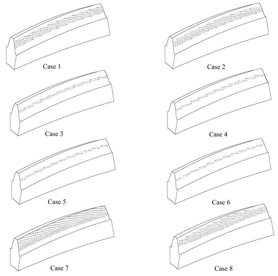 An algorithm of tooth contact analysis (TCA) has been applied to obtain the contact patterns on the tooth surfaces and the unloaded function of TE, according to [32]. Two pitch angles of the pinion of rotation are considered for tooth contact analysis. Besides, 21 consecutive and uniformly distributed contact positions are considered along three pitch angles. The contact patterns of the pinion for cases 1 to 8 are shown in the following Figure 6 with the correct alignment condition of their shafts.