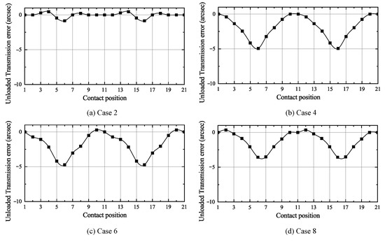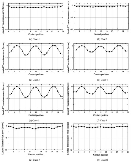 As shown in Table 5, the center distance error yields no TE in cases 1 and 7. The intersecting shaft angle error and the crossing shaft angle error have the lowest influence in case 7 among the four cases of design without micro-geometry modifications. However, the intersecting shaft angle errors and the crossing shaft angle errors have similar influences in cases 3 and 5. For cases 2, 4, 6 and 8 in which micro-geometry modifications were considered, the peak-to-peak level of the unloaded functions of TE is reduced compared with cases 1, 3, 5 and 7, respectively. Besides, case 2 has the lowest peak-to-peak level of unloaded TE among the four cases of design with micro-geometry modifications. Among the three errors of alignment being considered, the crossing shaft angle error has the largest influence on all design cases and should be limited to a very low level in real industry applications.