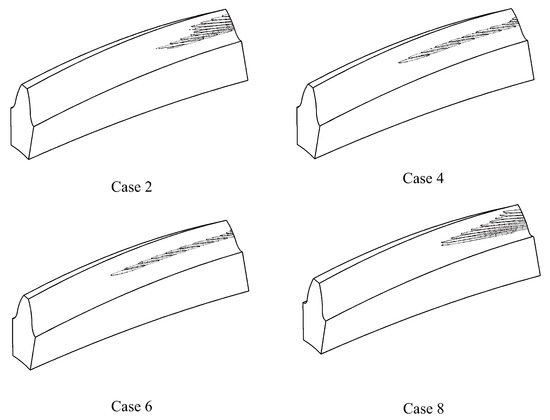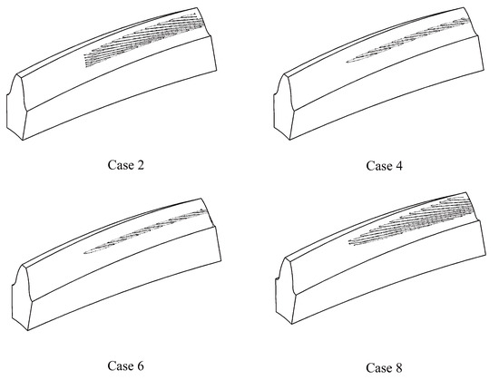 The peak-to-peak level of the functions of unloaded TE for cases 1 to 8 are listed in Table 5 considering different errors of alignment, according to [33]. In Table 5, indicates the center distance error, indicates the intersecting shaft angle error and refers to the crossing shaft angle error. The contact patterns for cases 2, 4, 6 and 8 considering an intersecting shaft angle error are shown in Figure 8, and the contact patterns for a crossing shaft angle error are shown in Figure 9. The center distance error for all design cases causes the contact patterns to move a little toward the top of the tooth surfaces.