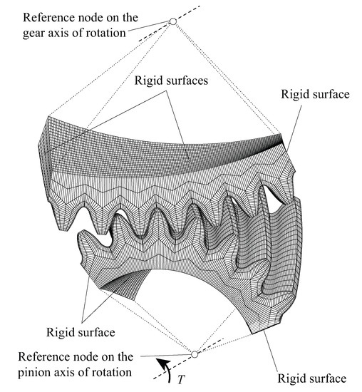- Fuentes-Aznar, A.; Ruiz-Orzaez, R.; Gonzalez-Perez, I. Computerized design, simulation of meshing, and finite element analysis of two types of geometry of curvilinear cylindrical gears. Comput. Methods Appl. Mech. Eng. 2014, 272, 321–339. [Google Scholar] [CrossRef]