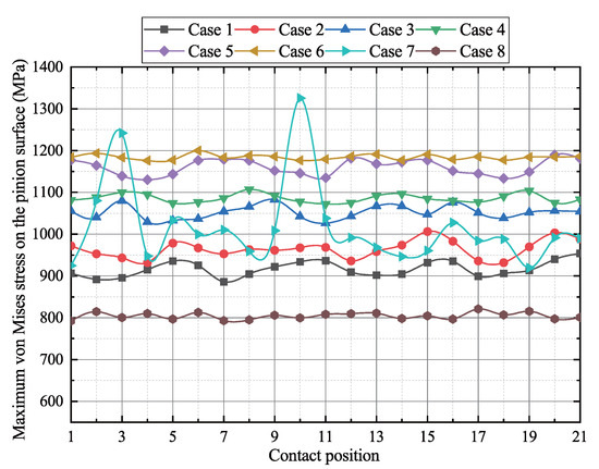 Figure 11 shows the variation of the maximum contact stresses of the pinion tooth surfaces with 21 contact positions considered. Figure 12 and Figure 13 show the field of the contact stresses for cases 1 to 8 at the contact position 11. Cases 1, 2 and 8 have similar contact patterns that are longer than those of cases 3 to 6, as predicted by TCA. However, for case 7 in Figure 13, the contact patterns extend to the top edge of the pinion tooth surfaces, causing the appearance of areas of edge contact that yield the largest contact stresses among the eight cases of design. The reason is that the active tooth profiles of both the pinion and the gear of case 7 are standard involutes without profile crowning or tip relief. For cases 1 and 2, the active tooth profiles are formed by a circular arc combined with an involute curve at the control point , avoiding the appearance of edge contacts on the top edge of the active tooth surface. For cases 3 and 4, the active tooth profiles are formed by a circular arc combined with an involute curve at , providing pure rolling meshing with a theoretical point contact type. For cases 5 and 6, the active tooth profiles are formed by a circular arc, providing pure rolling meshing with point contact at . Therefore, the contact patterns of case 3 to case 6 are located on the pitch circle and have a smaller major axis length than those of the other design cases. The maximum von Mises stresses of the pinion for cases 1 to 6 and case 8 are reduced by 28.02%, 24.05%, 18.30%, 16.46%, 10.24%, 9.47% and 38.08% compared with case 7, respectively. Besides, the maximum contact stresses of the pinion surface for cases 1 to 7 are increased by 16.23%, 22.65%, 31.94%, 34.90%, 44.95%, 46.19% and 61.49% compared with case 8, respectively. The longitudinal modification consisting of a parabolic crowning causes a small increment on the maximum contact stresses for cases 2, 4 and 6, at about 5.51%, 2.24% and 0.85%, respectively, with respect to their corresponding cases of design without any longitudinal micro-geometry modification as shown in Figure 11. However, the profile modification consisting of a circular crowning combined with a longitudinal modification of parabolic crowning (Case 8) results in a sharp decrement of the maximum contact stress (about 38.08%) for the traditional helical gears without micro-geometry modifications (Case 7).