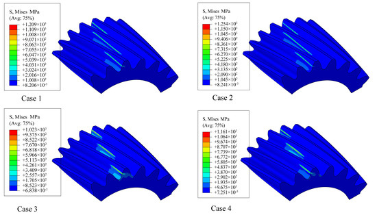 Field of von Mises stresses of pinion surface for case 1 to case 4.