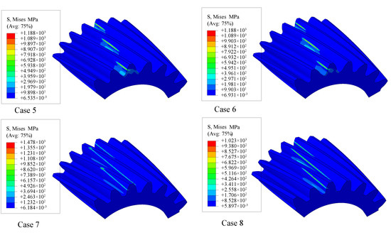 Field of von Mises stresses of pinion surface for case 5 to case 8.
