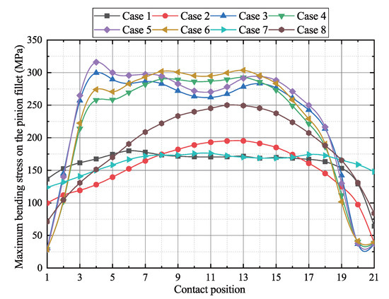 Figure 14 and Figure 15 show the variation of the maximum bending stresses for the eight gear pairs. As shown in Figure 14 and Figure 15, the maximum bending stresses of the pinion are higher than those of the gears for all eight design cases. Case 7, with the traditional design of helical gears without micro-geometry modifications, shows the lowest value of maximum bending stresses among all design cases, while case 5 has the largest value of maximum bending stress. In addition, cases 3 to 6 have similar maximum bending stresses for both the gear drive. Compared with case 7, the maximum bending stresses of the pinion are increased by 2.13% for case 1, 10.82% for case 2, 70.05% for case 3, 66.02% for case 4, 79.32% for case 5, 72.25% for case 6 and 41.90% for case 8. Compared with case 8, the maximum bending stresses of the pinion is increased by 17.00% for case 4 and 21.39% for case 6. However, the maximum bending stresses of the pinion are decreased by 21.90% for case 2. Similarly, compared with case 7, the maximum bending stresses of the gear are increased by 6.38% for case 1, 11.82% for case 2, 72.46% for case 3, 65.83% for case 4, 80.59% for case 5, 72.32% for case 6 and 29.56% for case 8. Compared with case 8, the maximum bending stresses of the gear are increased by 28.01% for case 4 and 31.99% for case 6. However, the maximum bending stresses of the gear are decreased by 13.69% for case 2. The reason is that the line contact between the tooth surfaces of case 1 and case 7 causes a much lower maximum bending stress compared with the point contact type of cases 3 to 6. In addition, the consideration of a profile circular crowning combined with a longitudinal parabolic crowning for case 8 results in a sharp increment of maximum bending stresses due to the localization of contact, whereas a longitudinal parabolic crowning contributes only slightly to increasing the maximum bending stresses for cases 1 to 6.