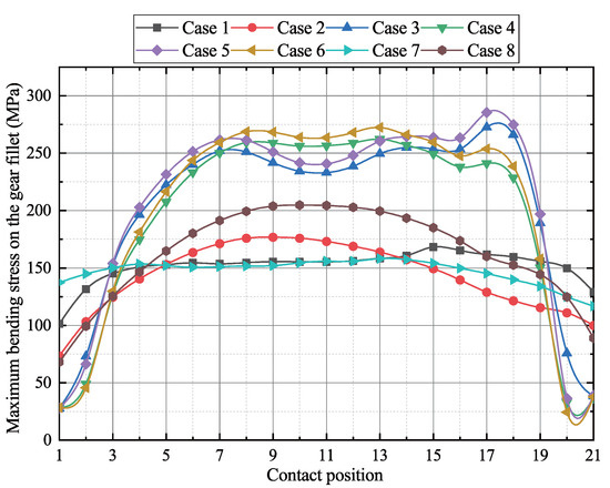 Variation of the maximum bending stress of the gear fillet for case 1 to case 8.