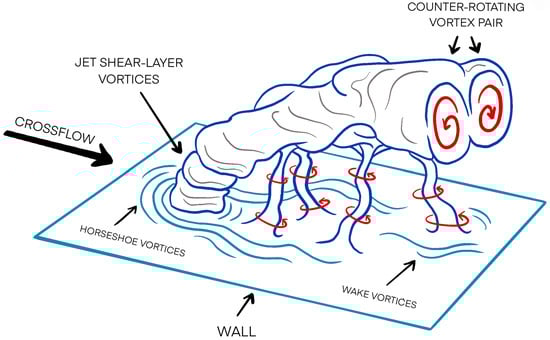 - Fric, T.; Roshko, A. Vortical structure in the wake of a transverse jet. J. Fluid Mech. 1994, 279, 1–47. [Google Scholar] [CrossRef]