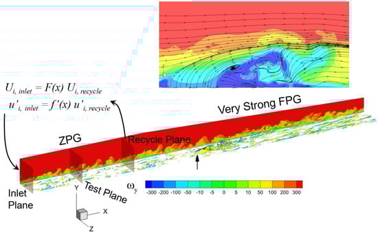 Capturing the physics of turbulent spatially-developing boundary layers by using DNS is not a trivial task due to the following reasons: (i) high mesh resolution is required in order to resolve the smallest turbulence scales (Kolmogorov and Obukhoff–Corrsin scales), (ii) the computational box must be large enough to appropriately resolve the influence of the turbulent “superstructures” (Hutchins and Marusic []) located in the outer region of the boundary layer, (iii) realistic time-dependent inflow turbulent conditions must be prescribed. Figure 2 shows a schematic of the computational domain in order to simulate the crossflow–jet interaction under a strong, favorable pressure gradient (FPG), which is prescribed by a top converging surface (sink flow). Without the prescription of any flow perturbation as in Araya et al. [] (i.e., vertical jet), the infringed flow acceleration in this region is so strong that turbulent intensities are significantly attenuated; however, the turbulence residual remains non-negligible with a logarithmic behavior of the Reynolds shear stresses. It was found in [] that the flow state was “laminarescence”, an earlier stage of the quasi-laminarization process, according to Narasimha and Sreenivasan [].
