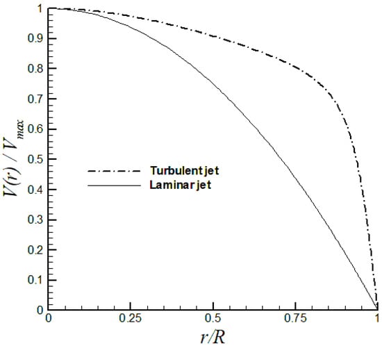 where r is the distance to the jet center, and  is the surface velocity at the jet center. For the unitary velocity ratio, a turbulent jet is set, based on the DNS study by Wu and Moin [], at  5300. Figure 3 shows the distribution of the prescribed vertical velocity at the jet location for both velocity ratios, with a flatter and more homogeneous velocity distribution for the turbulent jet or VR = 1. Furthermore, the dimensionless temperature of the jet (coolant) is prescribed as , while the normalized wall temperature is  0 and the normalized freestream temperature is  1.