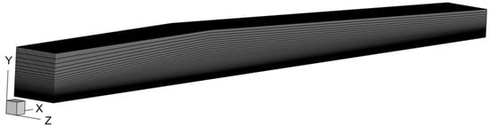 Table 1 summarizes the characteristics of the analyzed three (3) cases. One Baseline case is run (Case 1) by prescribing a zero pressure gradient (ZPG) on the transverse jet region, which means a constant cross-sectional area of the computational domain. The purpose of the Baseline case is to evaluate the effects of the streamwise pressure gradient on the downstream development of the jet wake. Information regarding the computational domain dimensions in terms of the inlet boundary layer thickness  (where ,  and  represent the streamwise, wall-normal and spanwise domain length, respectively) and the mesh resolution in wall units (, , ) is also supplied based on the inlet friction velocity. Readers are referred to Appendix A for suitability of the mesh resolution and time step as well as numerical validation. Figure 4 depicts a typical mesh with a grid point distribution of 600 × 80 × 80 for Case 2 and 3, while the point distribution was 440 × 60 × 80 in Case 1. Note that the streamwise domain length () includes the ZPG precursor zone for inflow turbulent information generation, as previously mentioned, which demands approximately 20 in all cases. Furthermore, the momentum thickness Reynolds number is approximately 400, just upstream of the transverse jet. The domain length was prescribed long enough (about 40–60) in order to appropriately capture the influence of large-scale motions (LSM) []. By comparing Cases 2 and 3, the effect of the blowing strength is evaluated in FPG flows.