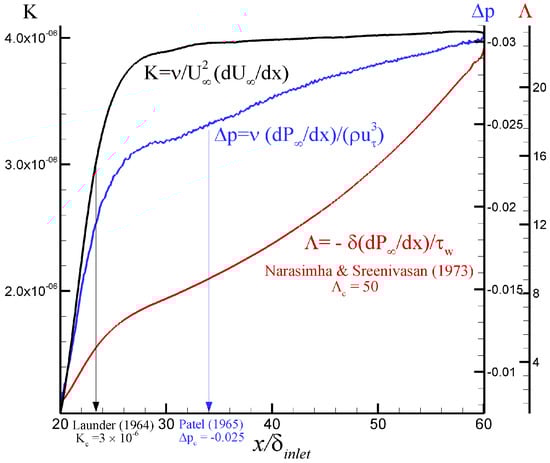 The crossflow jet simulations were initiated from a previous unperturbed DNS case []. After approximately twelve flowthroughs, samples were collected during the last 1900 non-dimensional time  for statistics computation, totaling 1200 flow fields. A flowthrough is the time it takes for a freestream fluid parcel to go from the domain inlet to the outlet plane. Figure 5 shows the streamwise development of some indicators of the onset of relaminarization for Cases 2 and 3 without the transverse jet and focusing on the zone . The acceleration parameter  rises abruptly at the ZPF–FPG intersection (18 ≤  ) to finally asymptote to the constant value of , beginning at  30. Based on [], the present flow should have been relaminarized (since K ); however, the  never achieves the laminar value for sink flows, as discussed in []. The critical K value of  suggested by Kline [] was achieved around  25. Furthermore, the critical value of  for  [] was reached at  34. Narasimha and Sreenivasan [] introduced the parameter  (where  and  are local values of the boundary layer thickness and the streamwise pressure gradient, respectively;  is the wall shear stress at the last ZPG station, upstream of the FPG region), defined as the ratio of the pressure gradient  to the characteristic Reynolds stress gradient . Thus, no prior knowledge of turbulent stresses was required to describe the mean flow. For large values of  (≥50), they demonstrated that the mean flow field could be split into an inner laminar sub-layer and an inviscid but rotational outer layer and used this criterion as an identifier of reversion. Nevertheless, the maximum computed value of  (∼22) is lower than the laminarization indicator of  = 50 proposed by []. Consequently, previous indicators of the relaminarization onset K,  and  have predicted relaminarization in our FPG region, except for the  parameter by []. More specifically, our strong FPG flow might be located within the “laminarescent” region (b) of [], just upstream of the relaminarization onset, which is consistent with the -computed values lower than 50 [].