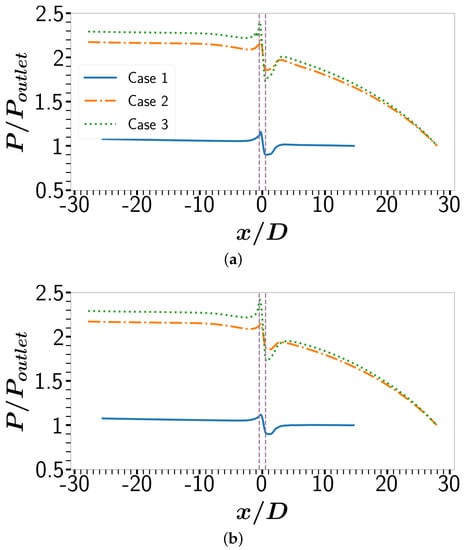 Figure 6a,b depicts the time-averaged static pressure with respect to the outlet pressure () at different vertical locations (i.e., at  = 5 and 50, respectively). The vertical dashed lines indicate the jet boundaries. Here, the streamwise coordinate x has been normalized by the jet diameter, D. Well upstream of the jet, it can be seen that the mean pressure remains constant, as a ZPG zone was imposed for turbulent inflow generation. These constant values in all three cases “accommodate” themselves to the “weakly” prescribed outflow pressure and strongly depend on the imposed velocity ratio () at the jet. Clearly, the higher the velocity ratio, the larger the upstream pressure and pressure drop through the jet. As the incoming turbulent flow approaches the jet, the constant injection of fluid induces adverse pressure gradient (APG) zones upstream and downstream of the jets (flow deceleration). These are the spikes in pressure that are observed. In contrast, the flow is significantly accelerated over the jets due to the presence of favorable pressure gradient (FPG), thus producing a drop in pressure within the jet. For Case 1, it can be seen that the APG zone close upstream of the jet is situated around , with a maximum value in the order of , whereas the APG region close downstream of the jet is within  with an “overshoot” of  in relative pressure in the near-wall region (e.g.,  for Case 1). In the other two cases (i.e., Cases 2 and 3), the APG regions are seen as well before and after the jet with longer and more evident streamwise lengths and peak values. As one moves farther from the wall, i.e., at  in the buffer region in Figure 6b, a similar picture of the pressure distribution is observed in all cases, with larger variations in peaks of pressure for Case 3. This is explained by the fact that a bigger velocity ratio ( = 1) was imposed in Case 3 with respect to the other two Cases 1 and 2 ( = 0.5). Therefore, the injected fluid can penetrate further into the incoming turbulent boundary layer, causing important changes in the buffer and log regions. However, the streamwise zone of influence of APG is very short downstream of the jet, around  in length. Focusing on the well downstream zone from the jets, mean pressure tends towards the outflow value and quickly recovers the prescribed streamwise pressure gradient. In Case 1, where a zero pressure gradient was also imposed downstream, this pressure recovery occurs within four to five D’s from the jet. On the other hand, for Cases 2 and 3, a strong streamwise favorable pressure gradient (FPG) was prescribed downstream (with the acceleration parameter K equal to , as described in Figure 5). The pressure recovery after the flow perturbations caused by the jet takes much longer (≈15D).