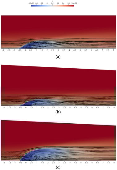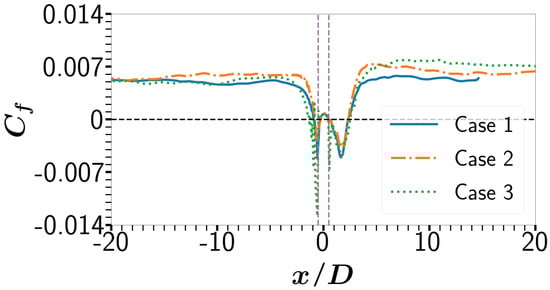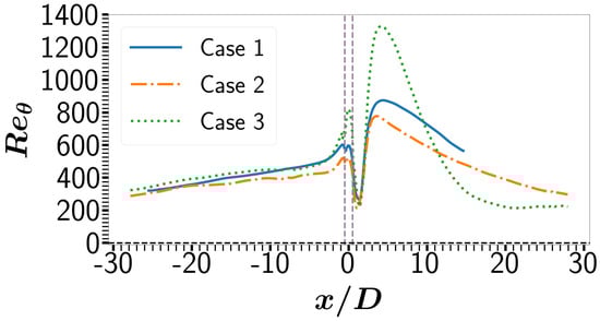 Figure 8 presents the momentum–thickness Reynolds number () for all three cases. Upstream of the vertical jet,  profiles exhibit the typical linear increase in the canonical boundary layer (ZPG). The presence of flow deceleration just before the jet induces APG and, consequently, a growth of the boundary layer and momentum thickness. The strong acceleration (FPG) infringed in the flow over the jet makes the boundary layer thinner, reducing  locally. An obvious recovery on  profiles can be observed in the near downstream region of the jet.