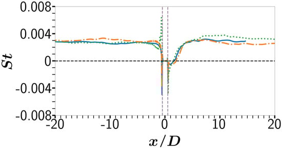 where k is the thermal conductivity of the fluid and  is the thermal gradient at the wall in the y-direction. Figure 10 depicts the streamwise variation of the Stanton number for all three cases. Positive values of  mean that the fluid is transferring heat to the surface, while negative values indicate the opposite process. The variation of the Stanton number, , exhibits a similar trend as , which may reveal that the Reynolds analogy is somehow fulfilled but not completely satisfied since there is not an increase in  across the jet hole as in the  profile. This is consistent with previous conclusions from the literature since a very strong streamwise pressure gradient is a source of dissimilarity between the momentum and thermal field [].