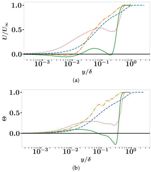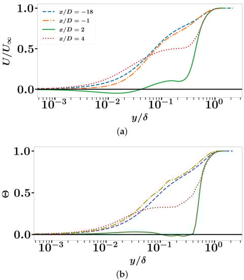 Figure 11, Figure 12 and Figure 13 show how the streamwise velocity behaves from the wall to the freestream position and the dimensionless temperature difference () at varying streamwise distances from the jet center ( and 4). The mean streamwise velocity and temperature have been expressed in outer units, which means that freestream values are used in the normalization process. Furthermore, the vertical coordinate y is dimensionalized by the local boundary layer thickness . The corresponding flow profile at  can be considered the “baseline” profiles located far upstream of the jet (ZPG region). These baseline profiles are used to evaluate the distortion level exhibited after going through localized blowing perturbations. Readers should note the high level of similarity between  and  profiles at , indicating that the Reynolds analogy is clearly satisfied. The physical reason is attributed to the no-presence of a streamwise pressure gradient and a nearly unitary value of the Prandtl number (Pr = 0.71). Moving closer to the vertical jet, for both  and  profiles in Case 1, the values stay mostly positive at all distances. The only major differences are found at , where flow recirculation (flow separation in the mean flow is dictated by negative values of U) can be observed in the range . At this location that is close to downstream of the jet, the injected momentum blocks the flow downstream, which causes flow retardation and separation. Case 2 presents almost the same behavior as Case 1, given that both have the same blowing ratio even though Case 2 is under FPG. The effect of flow acceleration in Case 2 can be described by a separation flow bubble “pushed” toward the wall. For Case 3, the situation significantly changes due to its high blowing ratio compared to the previous cases. The incoming boundary layer exhibited a strong deceleration, as seen in the negative U values of the profile at . At a distance of four diameters from the jet center, the streamwise velocity depicts significant distortion, with flow acceleration in the buffer layer and the presence of a “downward dip” around  0.3. This local flow deceleration is caused by the “encounter” of the jet trajectory with the freestream, inducing a shear layer. This means that when the outer inviscid and irrotational flow (coming from outside the turbulent boundary layer or TBL) penetrates into the TBL creating “valleys” (and “bulges”), it encounters the upward fluid motion by the streamwise vortices represented by the “legs” of the CVP, creating a stagnation point, and consequently, a shear layer. The reader is referred to Figure 2 (and its discussion) in the study by Lee et al. []. More discussion on this matter is supplied later on. In terms of the mean thermal profiles , Case 1 exhibits a lengthy isothermal region between  at . A zero value for the  parameter indicates that the local temperature corresponds to the wall temperature, according to the normalization considered. This is consistent with the local presence of flow recirculation or bubble, which curtails heat transfer. Note that the local Stanton number is zero. In Case 2, this isothermal region is significantly much smaller, ranging  at . It is concluded that FPG makes the recirculation zone smaller along the vertical direction. On the other hand, Case 3 shows negative values of  around  at . It can be stated that the cold fluid emanating from the vertical jet () has mixed with the incoming crossflow. In other words, these negative values in  mean that there is significant thermal mixing in these areas.