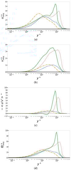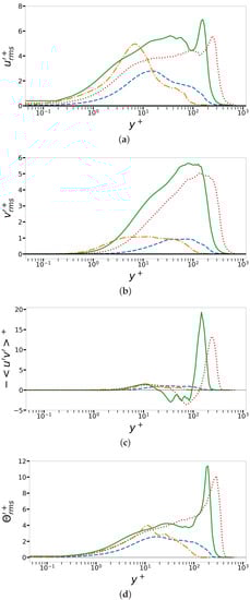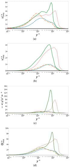 Figure 14, Figure 15 and Figure 16 depict the root mean square (RMS) of flow fluctuations or turbulent intensities (i.e., ,  and ) as well as the Reynolds shear stresses (−<>) for the three cases at −18, −1, 2 and 4. It is worth mentioning that flow statistics were computed in the centerline mid -plane and were only time-averaged (no spanwise averaging). Furthermore, local wall units were utilized. In general, rms of the streamwise and wall-normal components of the velocity fluctuations ( and ) are greatly enhanced just downstream of the jet, by a distance of two to four diameters. As expected, Case 3 with VR = 1 possesses the largest increases in  and . It can be concluded that vertical transport of momentum is considerably intensified downstream of the jet. The almost six-fold increase in  peak values (as compared with the baseline profile at ) for Case 3 supports the previous statement. Cases 1 and 2 possess the same velocity ratios (VR = 0.5) and exhibit similar degrees of increases in  and . One may speculate that there is not a concrete influence of streamwise pressure gradient on the velocity fluctuations in the near downstream region of the jet. However, previous conclusions may be scaling-dependent since the friction velocity (not shown) and skin friction coefficient are strongly attenuated by the recirculating flow. Interestingly, the  and < profiles at  2 and 4 in all cases show evident secondary outer peaks around  100–200, which is associated with the presence of a shear layer. According to Pope [], turbulence events inside the boundary layer can be classified by quadrants as: Q1 or outward interactions ( > 0 and  > 0), Q2 or ejections ( < 0 and  > 0), Q3 or inward interactions ( < 0 and  < 0), and Q4 or sweeps ( > 0 and  < 0). Here,  is the instantaneous streamwise velocity fluctuation, whereas  is the instantaneous wall-normal velocity fluctuation. The upward entrainment (Q2 motions) provoked by both streamwise vortices of the CVP and the inward Q4 motions induces a local flow deceleration and the formation of this shear layer. The presence of this shear layer significantly enhances turbulent mixing (Reynolds shear stresses) and thermal fluctuations. Clearly, the turbulence production is greatly augmented as well, since the major contributing component, i.e., the product of the Reynolds shear stress and the local velocity gradient (<>), is boosted. The Reynolds shear stresses at  2 and 4 in Case 3 depict noticeable positive values (events in the Q1 and Q3 quadrants mostly contribute to the Reynolds shear stresses). Furthermore, the fact that  and  are positively correlated in the buffer-log region () for Case 3 is attributed to the strong backflow. Case 2 has not shown the presence of positive <>, while in Case 1, some positive values of <> were detected at  2 and  20. It can be concluded that FPG counteracts the recirculation or backflow effect on developing positive cross-correlations on  and .