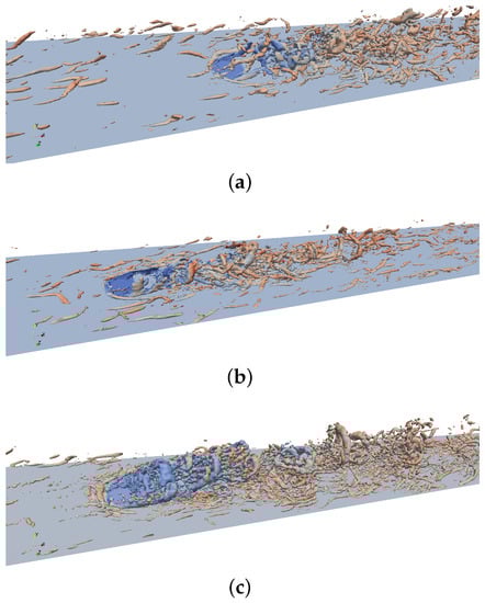 Visualization of coherent structures by means of -criterion iso-surfaces: (a) Case 1, (b) Case 2 and (c) Case 3 (colored by temperature).