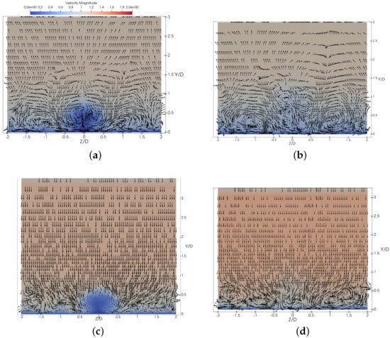 For the three cases that were studied, we wanted to evaluate how the injected momentum was vertically transported and convected downstream. Figure 18 shows contours of velocity magnitude at two distances from the jet center:  = 2 and 7.5. Furthermore, in the plane , velocity vector plots are included. In all cases, and very close to downstream of the jet (i.e., at  = 2), the core of the counter-rotating vortex pair (CVP) is clearly observed. Notice the “mushroom”-like structure in Case 3 (deep blue zone). The CVP pumps up low-speed fluid, which encounters a downward motion, giving birth to a shear layer (∼ = 1) with low values of the fluid velocity. It has been previously explained that this shear layer enhances turbulence mixing and production. From the figures, it can be seen that at both velocity ratios VR = 0.5 and 1, the CVP structure went through a severe attenuation. It is interesting to see the strong downward motion (velocity vectors pointing towards the wall) in Cases 2 and 3, even in the outer part of the boundary layer (inviscid and irrotational region). This is caused by the prescription of strong FPG in sink flows.