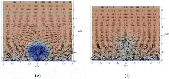 Iso-contours of the mean velocity magnitude with vector plots at different  planes,  = 2 and 7.5. (a)  = 0.5 ZPG  = 2. (b)  = 0.5 ZPG  = 7.5. (c)  = 0.5 FPG  = 2. (d)  = 0.5 FPG  = 7.5. (e)  = 1 FPG  = 2. (f)  = 1 FPG  = 7.5.