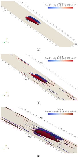 Figure 19 exhibits iso-surfaces (positive and negative values) of the time-averaged wall-normal vorticity ( [1/s]) of the three DNS cases in this study. The horseshoe vortices “encircling” the jet can be seen. As previously discussed in Figure 18, the underlying vortices at low-velocity ratios dissipate quickly; while at higher velocity ratios, the turbulent structures stay coherent for longer distances downstream of the jet. Furthermore, the presence of the counter-rotating vortex pair (CVP) is evident and both “legs” have been perfectly captured by extracting constant values of  (positive in red, negative in blue). There is an obvious damping effect of the favorable pressure gradient (FPG) on the CVP wake development for the same velocity ratio (Case 1 vs. Case 2). Far downstream of the jet and in the near-wall region, iso-surfaces of vertical vorticity show an oblong shape with a spanwise squeezed silhouette since very strong FPG induces a stretching process, particularly on low/high-speed turbulent streaks and streamwise vortices.