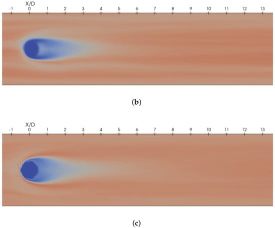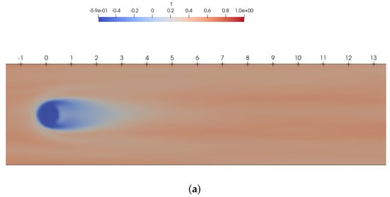 Taking a top view of the time-averaged temperature of the cases (Figure 21) allows us to visualize the downstream convection and diffusion of the passive scalar (temperature) introduced at the jet. The  plane is very close to the wall, located in the linear viscous layer. It is seen that for the low-velocity ratio, the cold fluid zone (blue) assumes an elliptical shape with a little larger streamwise dimension in Case 2. It can be inferred that flow acceleration due to FPG convects the passive scalar more effectively, as seen in Figure 21a,b. These colder flows, as compared to the incoming hot flow in red, stay longer and closer to the wall, thus having a longer protecting effect. With the high-velocity ratio as in Case 3, the jet intrudes more into the turbulent boundary layer, thus having less cooling effect on the surface. Furthermore, note the expansion of the cold fluid zone at the lateral regions of the jet. This effect most likely occurs due to the stronger horseshoe vortex formation.