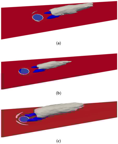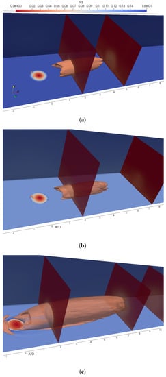Iso-surface extraction of the Turbulent Kinetic Energy (TKE) was performed and plotted in Figure 22 in order to identify and visualize the CVP structure caused by the crossflow jet. From Figure 22, it can be interpreted that in the low-velocity ratio cases (i.e., Cases 1 and 2), there are some zones with high levels of TKE downstream of the jets. Clearly, the recirculation flow zone or bubble possesses a low level of turbulent kinetic energy. The external boundaries of the CVP are dictated by high values of TKE. In Cases 1 and 2 with VR = 0.5, the TKE iso-surface zone is dissipated quickly by four diameters from the jet center. On the contrary, in the high-velocity ratio case (Case 3), not only the kinetic energy remains coherent for a longer distance downstream, but it is also present upstream of the jet. In that region, the presence of a strong APG causes turbulence enhancement. Considering the instantaneous velocity fluctuations in the streamwise () and in the perpendicular direction (), one can infer how the events in the turbulent quadrant affect the turbulent transport of momentum. The cross-correlation of  and  is called the Reynolds shear stress, which plays a crucial role in turbulent mixing. The extracted iso-surfaces (negative and positive) in Figure 23 show negative values of <> in the shear layer zone (top boundary of the CVP) as well as in the horseshoe vortex formation, which means that we have ejection (Q2) and sweep (Q4) events dominating these regions. The positive <> regions are attributed to backflow and boundary layer detachment (domination of Q1 and Q3 events), as previously reported in the literature. As seen in the previous Figure 23a–c, although all three cases show both positive and negative <> values, Case 3 with the high-velocity ratio has the larger influence areas where the flow remains coherent.