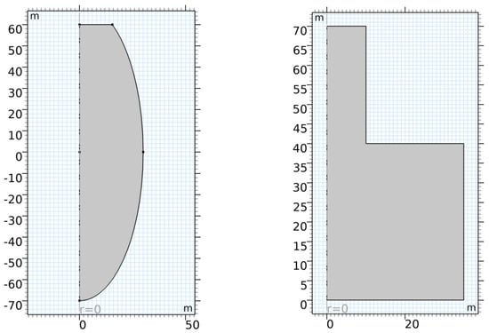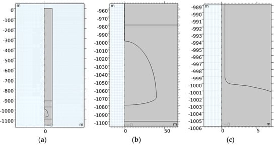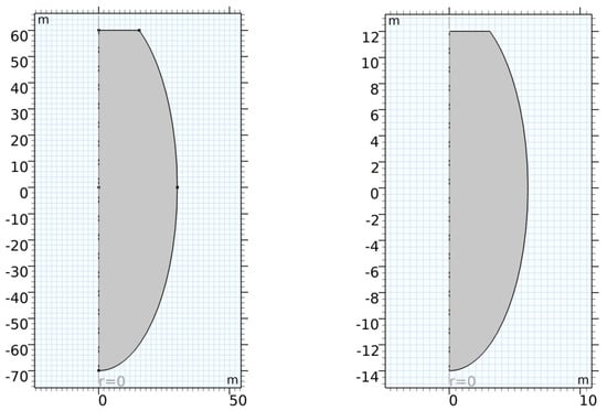In this study, COMSOL software was adopted for numerical simulation. The geometric shape of the salt cavern for gas storage was simplified according to the actual shape of the dissolved salt cavity on site. The shape of the surrounding wall of the salt cavity on site was irregular; thus, it was simplified to a more regular shape, which was convenient for modeling. The cavity data measured by sonar was also modeled according to the shape measured by sonar, which was closer to the engineering practice. The buried depth of the salt cavern was generally between 500 m and 1500 m. If the wellbore and salt cavity were completely modeled, the area involved was very large and the calculation was extensively time consuming. Therefore, in order to improve the calculation efficiency, a two-dimensional axisymmetric modeling method was employed for the wellbore and cavity integrated thermodynamic coupling model. The specific geometric parameters of the model referred to a gas storage salt cave in Jintan, Jiangsu Province, China. The height of the model was 1100 m and the radius was 80 m, the maximum height of the cavity was 74 m and the maximum radius was 40.15 m, the volume of the cavity was approximately 198,720.1 m3, the buried depth of the cavity was 1012 to 1086 m, and the diameter of the wellbore was 0.25 m. The length of the wellbore was 1012 m, and the shape of the sonar-measured cavity is shown below.