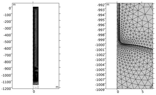 The integrated thermodynamic coupled model included multiple physical fields, including turbulence, solid and fluid heat transfer, solid mechanics, non-isothermal flow, and thermal expansion. The model was divided according to the characteristics of the physical fields. In the processes of gas injection and gas withdrawal, there is a large temperature gradient and stress gradient at the cavity wall and well wall; thus, the grid at the wall had to be encrypted. Therefore, five boundary layers were set at the wall; the model contained a total of 32,923 domain elements and 3185 boundary elements (Figure 3).