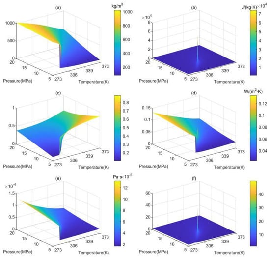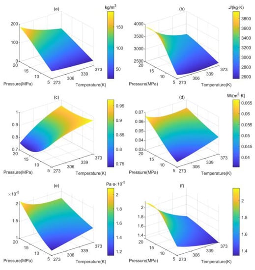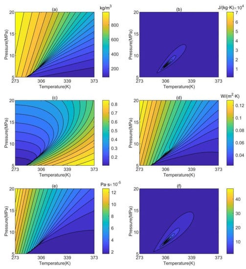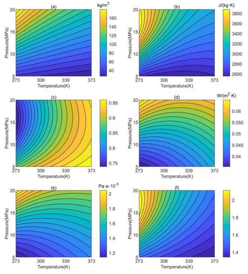 Figure 6 illustrates in a three-dimensional bar chart the physical properties of carbon dioxide when subjected to operation conditions, i.e., a temperature ranging from 273 to 373 K and pressure ranging from 5 to 20 MPa. Figure 7 shows the contour plots of the thermophysical properties of carbon dioxide. The critical temperature of CO2 was 304.13 K and the critical pressure was 7.4 MPa. There were sudden changes in the properties of CO2 near the critical temperature and pressure. Compared with methane, carbon dioxide showed a more complex variation with temperature and pressure, particularly around critical conditions.