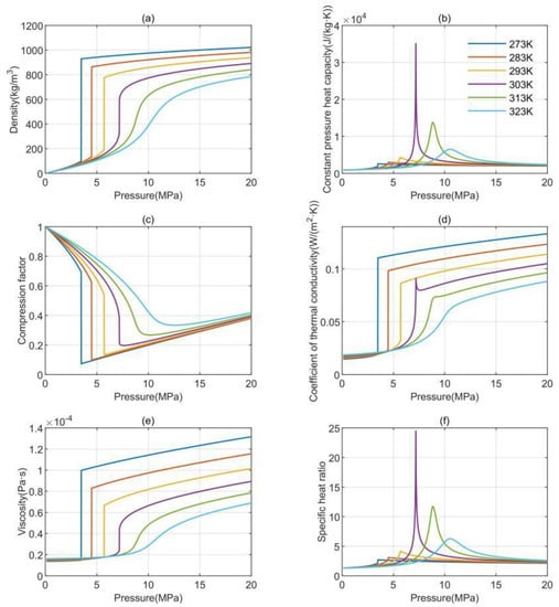 To more clearly demonstrate the dependence of CO2 on temperature and pressure, temperatures of 273 K, 283 K, 293 K, 303 K, 313 K, and 323 K were selected for the comparison of thermodynamic properties. Density (Figure 8a) increased with rising pressure. When the temperature was lower than the critical temperature, there was a dramatic change; when the temperature was higher than the critical temperature, the curve became smooth. The isobaric heat capacity (Figure 8b) fluctuated and reached its peak value at critical temperature; the corresponding pressure for the peak values at different temperatures increased. Specific heat capacity (Figure 8f) showed a similar variation to isobaric heat capacity. When the pressure was lower than the critical pressure, the compressibility factor (Z; Figure 8c) decreased with increasing pressure and then increased; after the critical temperature, the Z values were close to a constant of 0.4 and were mainly controlled by pressure. The thermal conductivity (Figure 8d) increased with rising pressure; when the pressure was higher than the critical pressure, the values of thermal conductivity differed between different temperatures. Viscosity (Figure 8e) showed a variation similar to thermal conductivity.